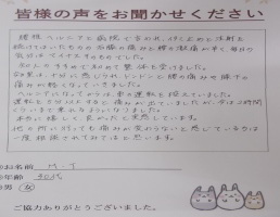 会社の同僚が紹介してくれました。来た初日に肩の辛さと頭痛はなくなったのには びっくりしました。その後、通っていくうちに「腰の痛みも少ずつなくなりました。